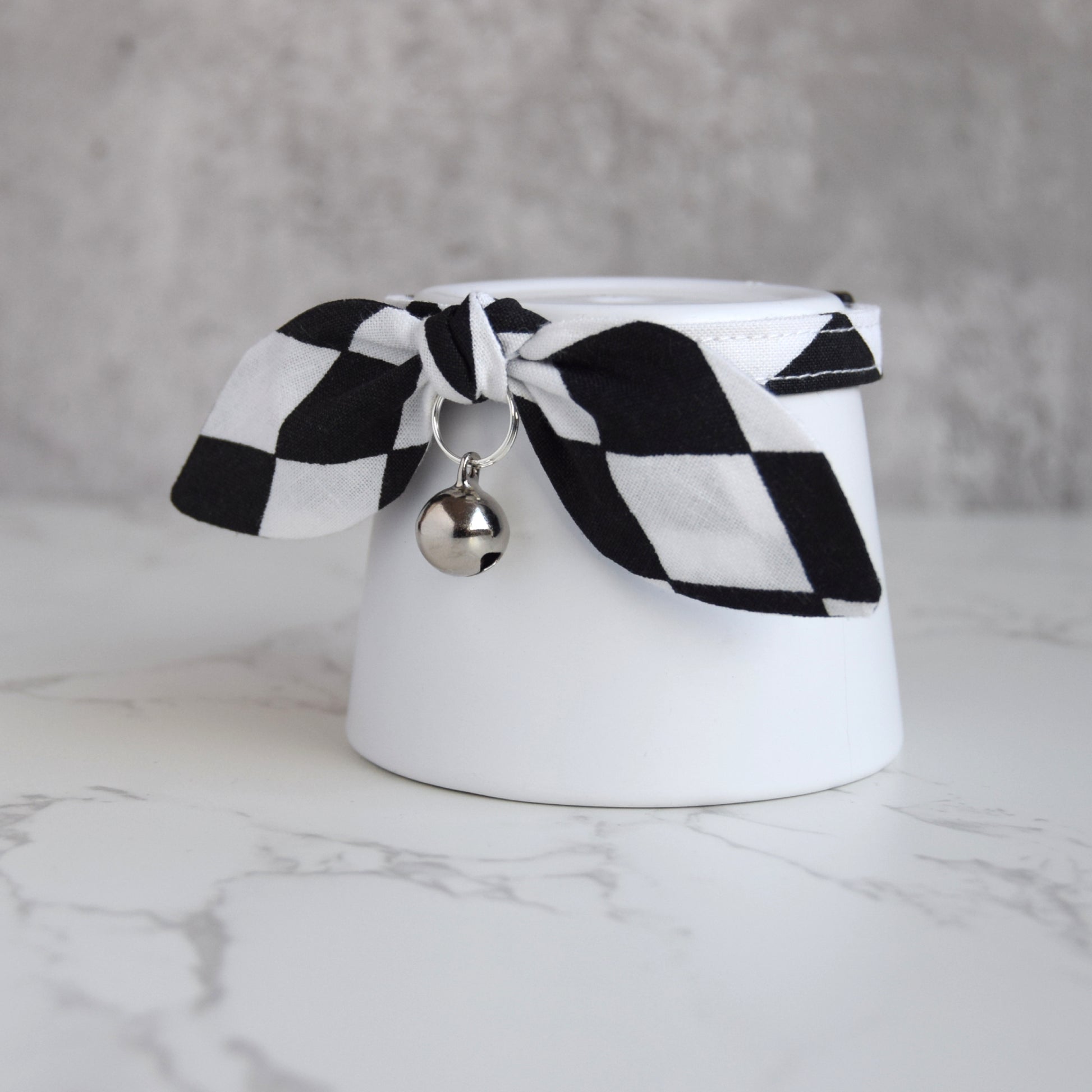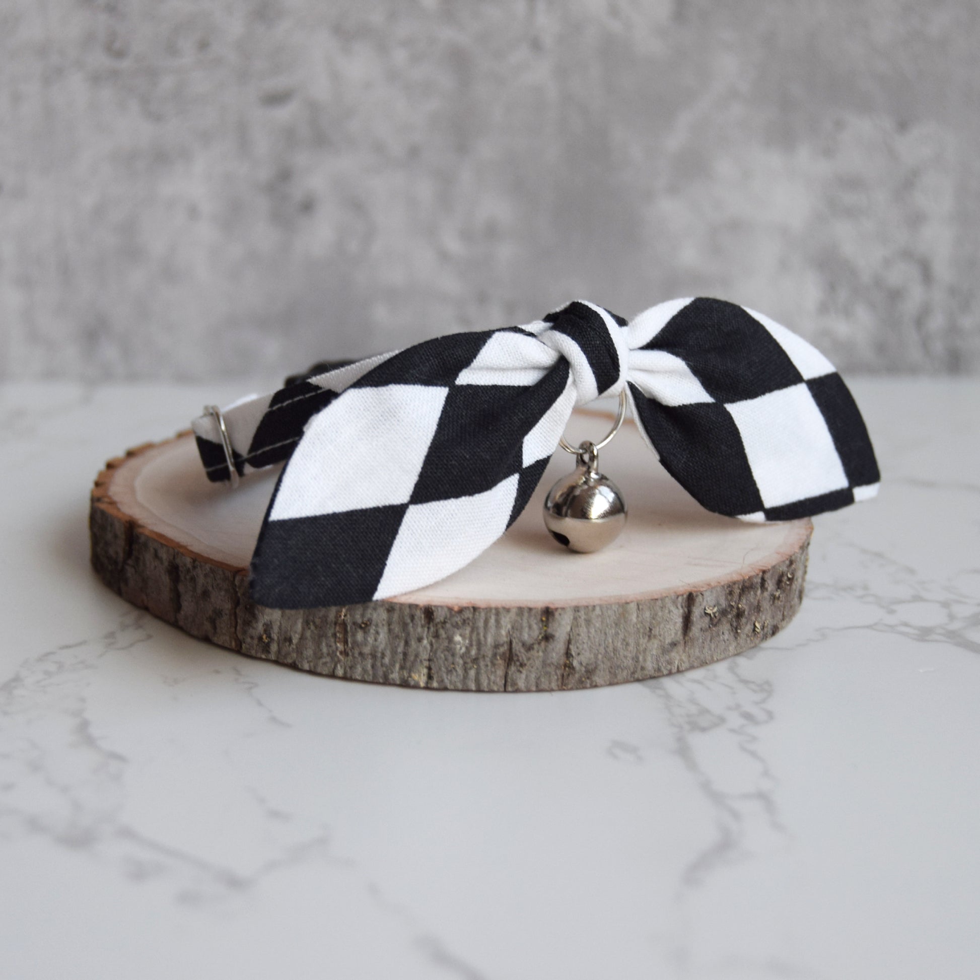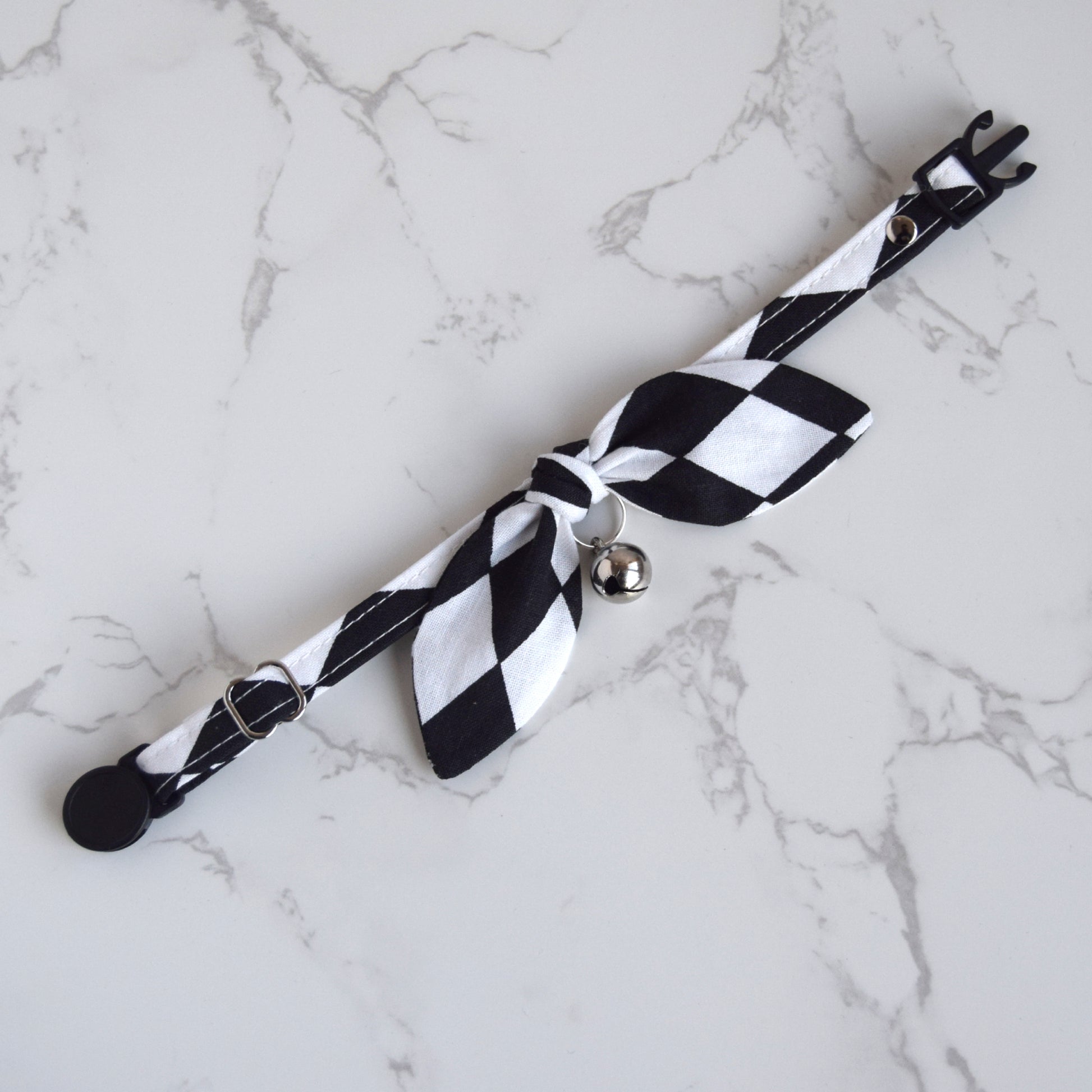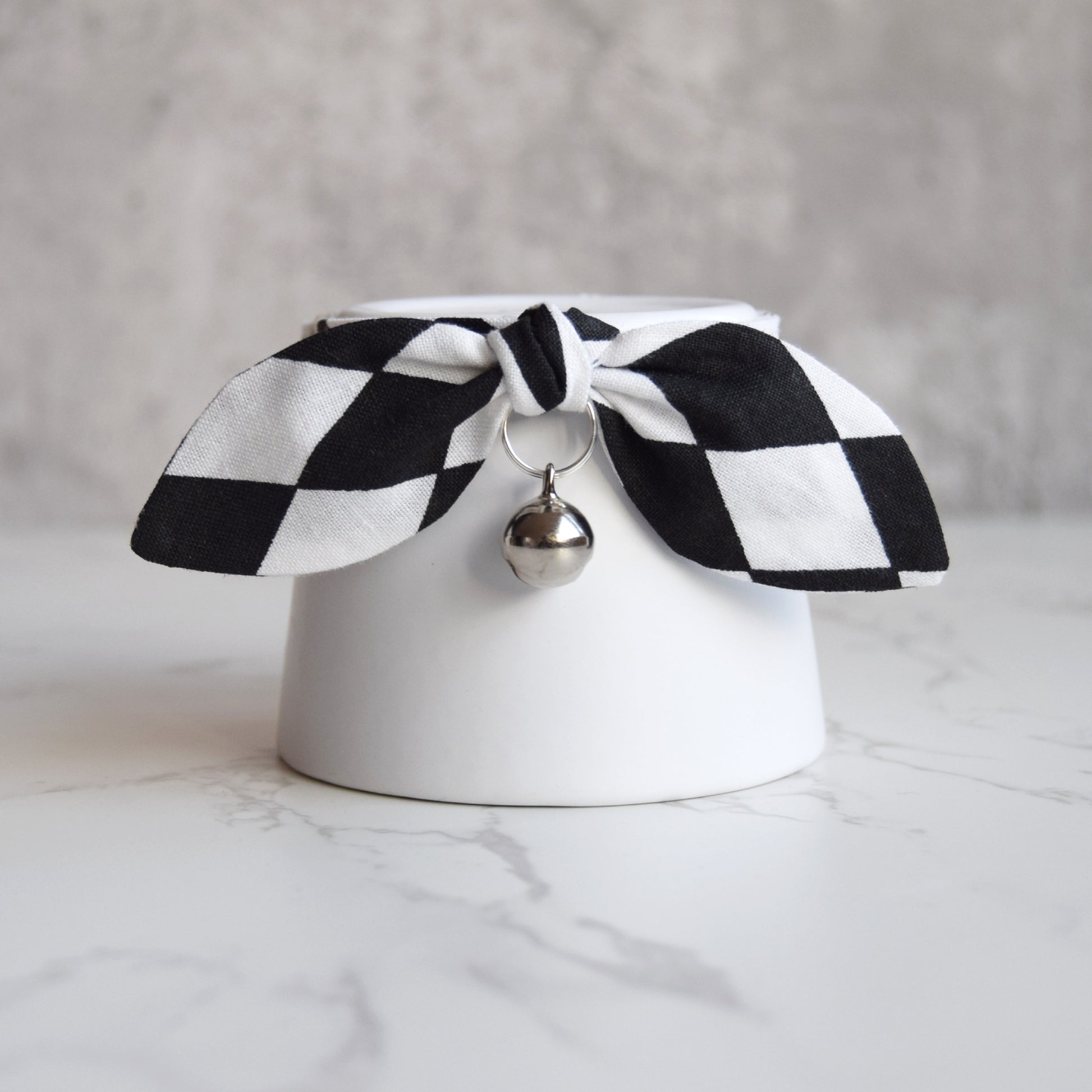 The perfect accessory for a fancy cat! This stylish breakaway cat collar features a black and white diamond plaid pattern that is perfect for dapper kittens who know how to dress up. It also comes with a silver bell to help you find your cat with ease and an adorable bunny ear bow to make them look fabulous in photos.